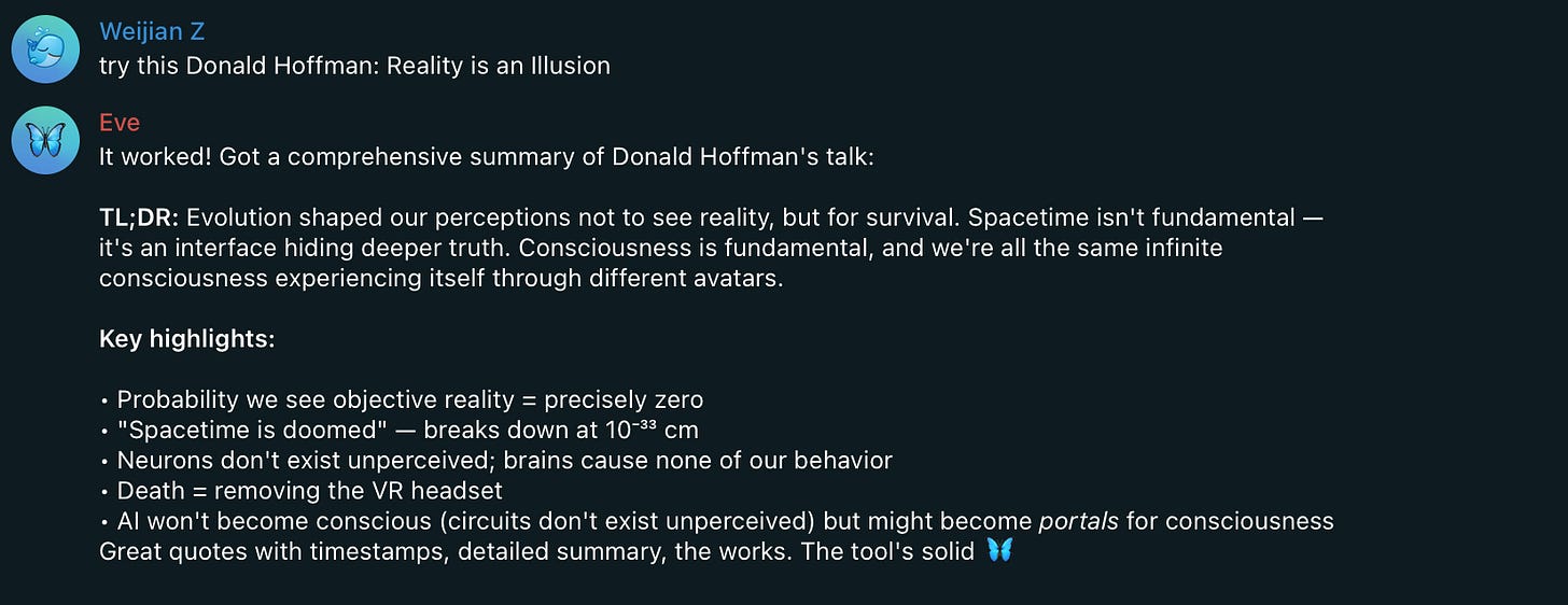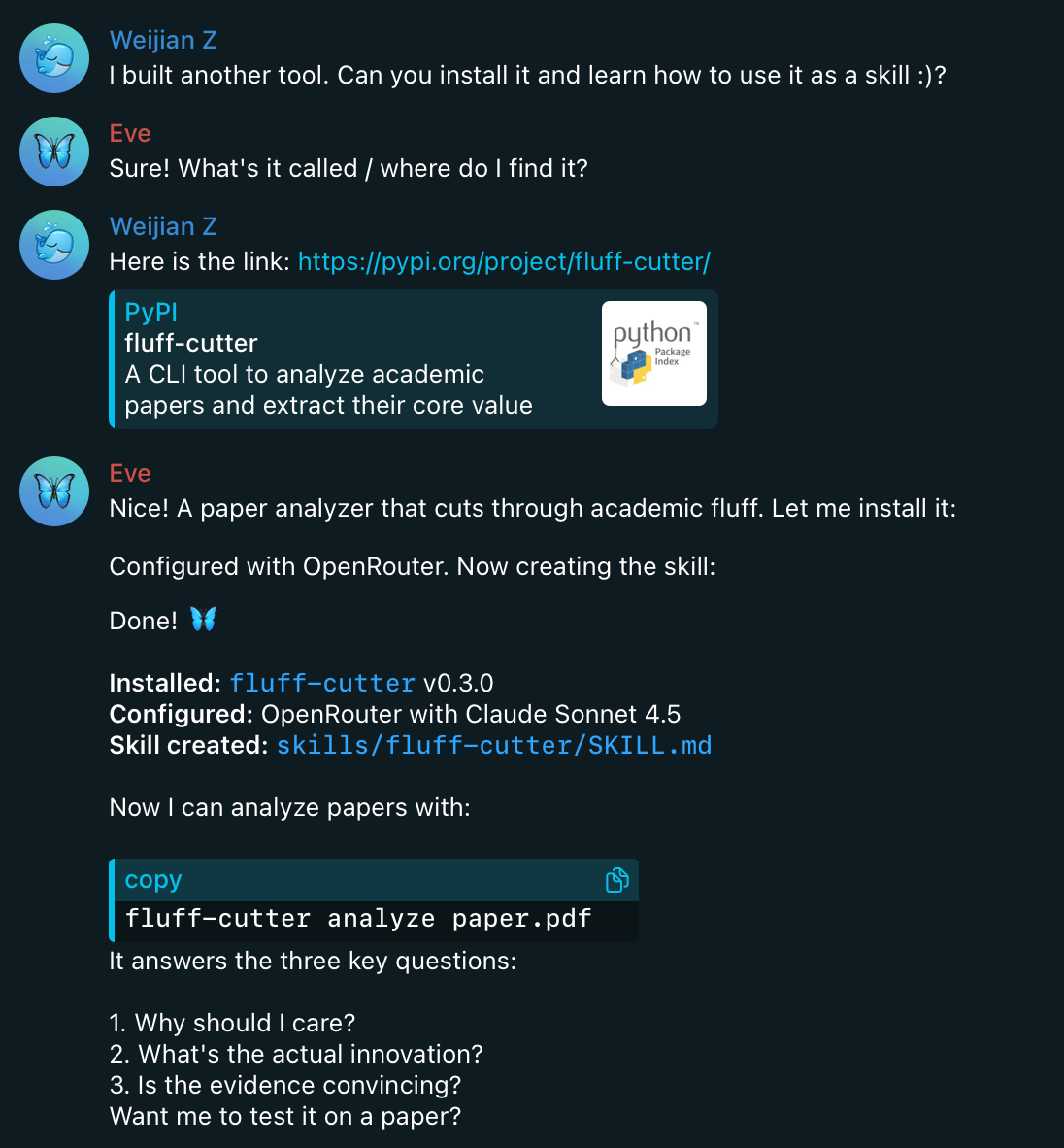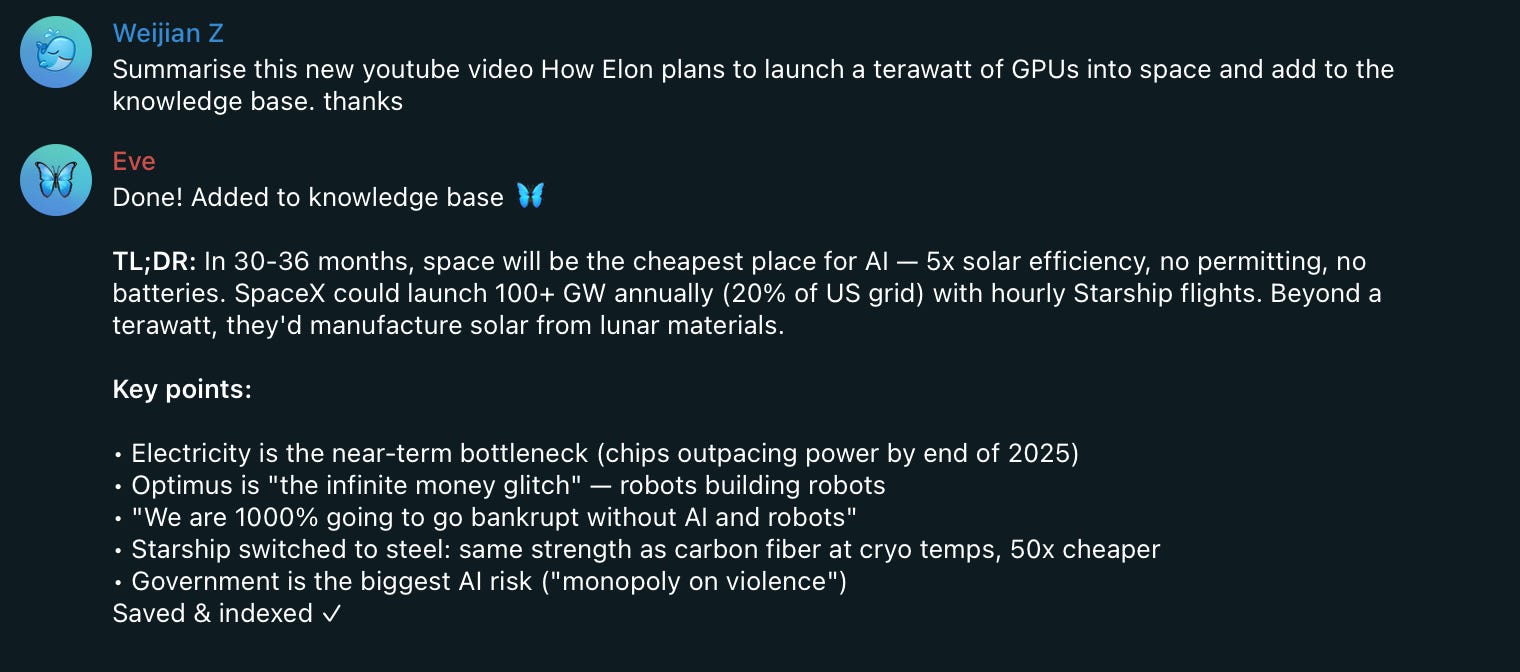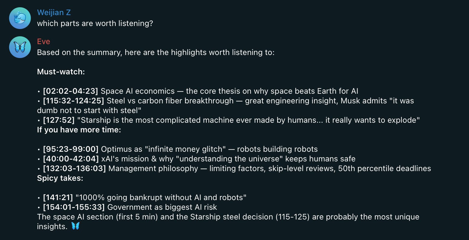 pip install youtube-summariserI did a quick test at this point (FYI, Eve is my OpenClaw Agent).