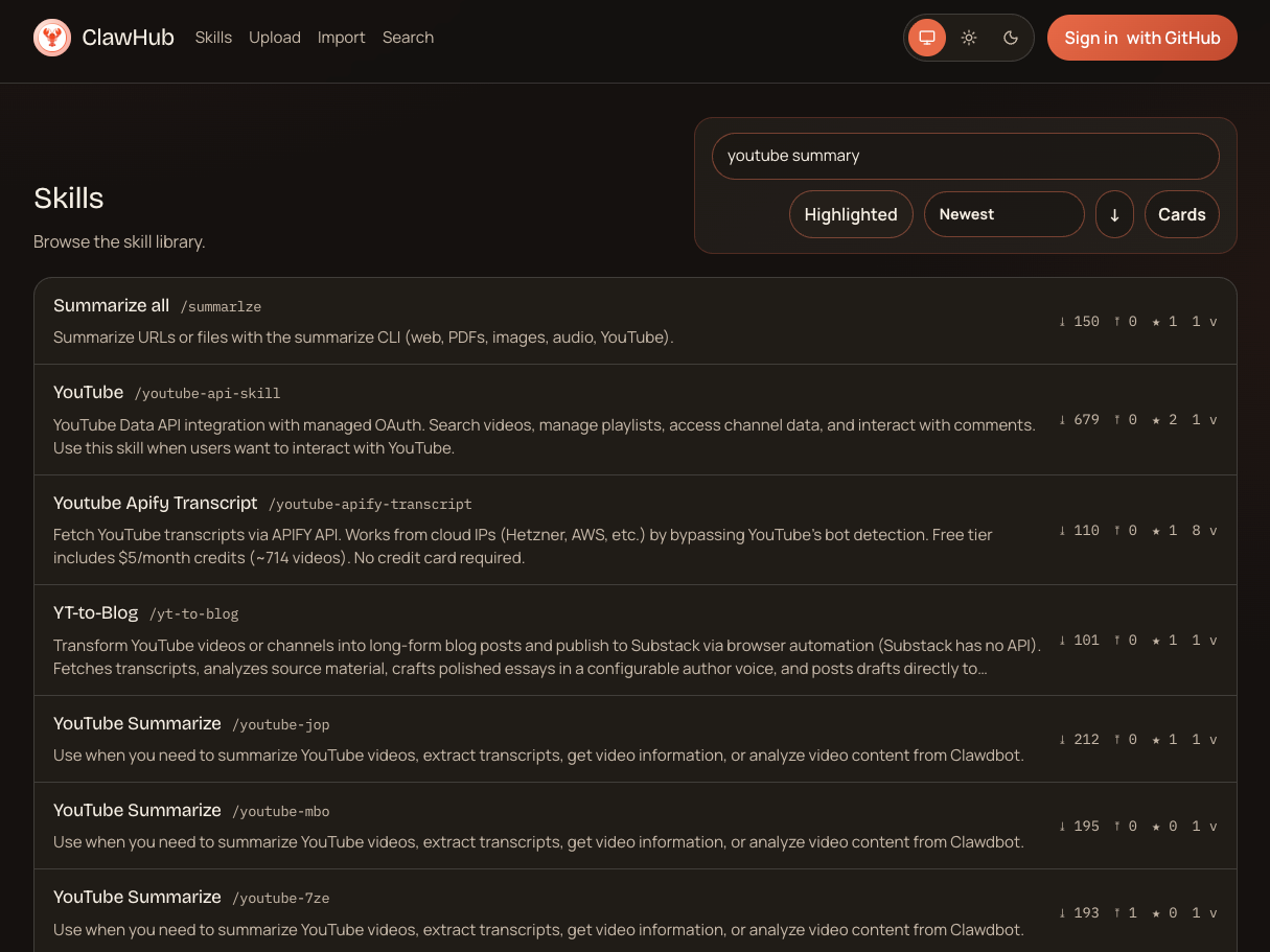 At one point I wondered whether it was worth uploading this skill to ClawHub. So I did a quick search for “YouTube summary” and… yeah. There are tons of them already. No real reason to add another drop to that ocean.